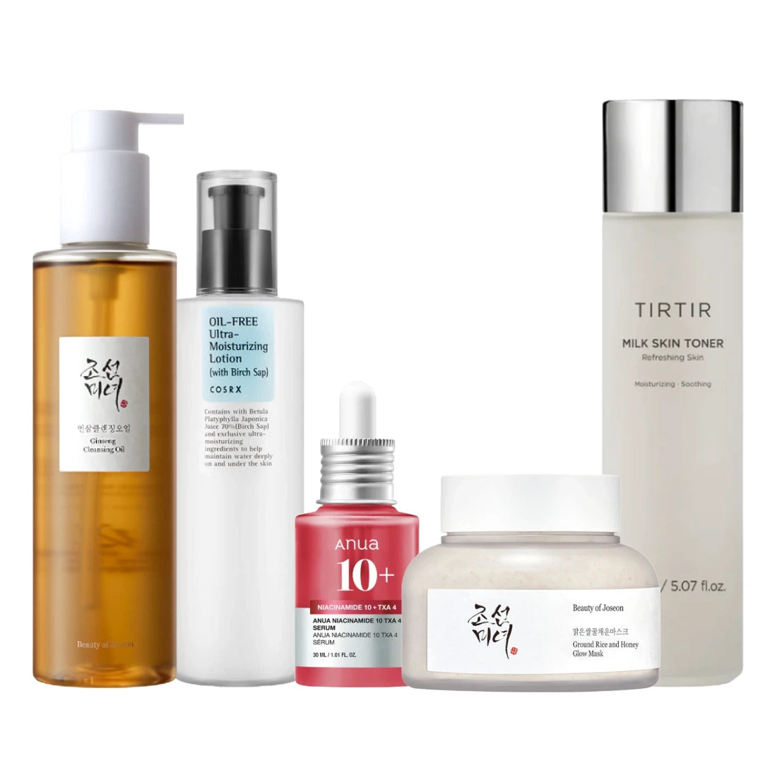 Døjer du med en ujævn hudtekstur, små underliggende knopper eller "jordbærhud" med mørke prikker? Denne rutine er sammensat specifikt til at løsne tilstopninger, lysne mørke porer og fugte huden uden at fedte. Ved hjælp af eksfolierende ris, sebum-regulerende niacinamide og lysnende tranexamic acid, arbejder produkterne sammen for at give dig en klarere og mere ensartet hud ("glass skin").